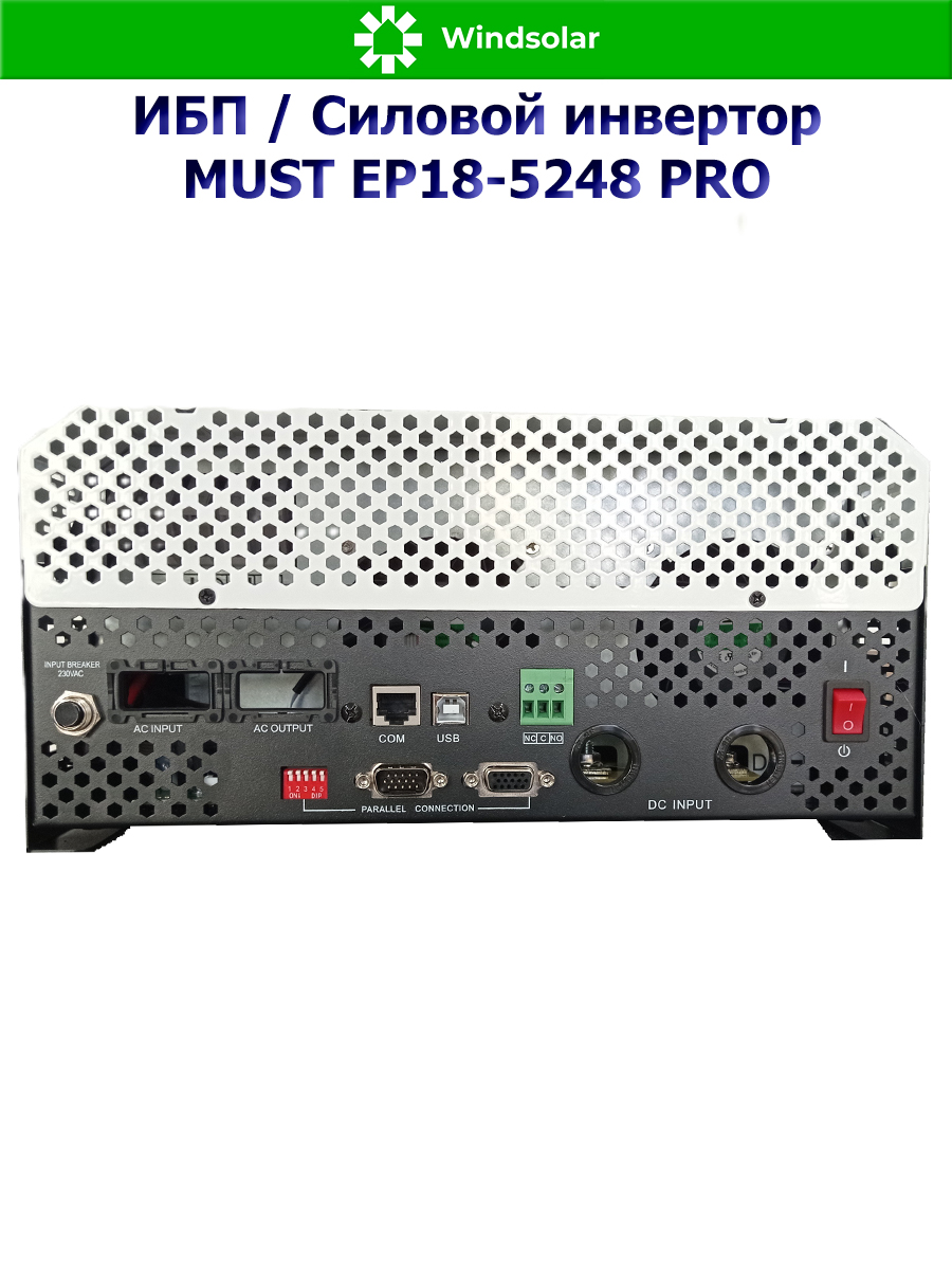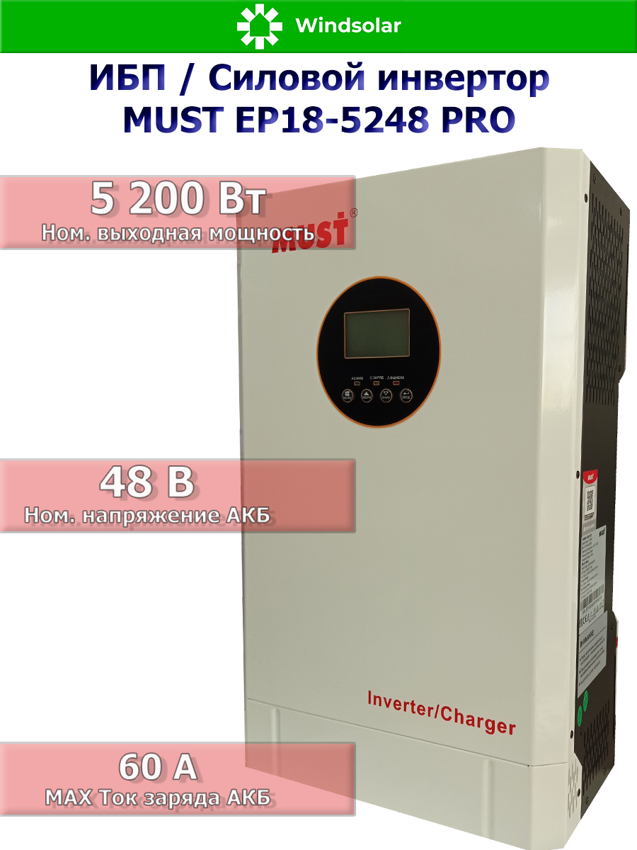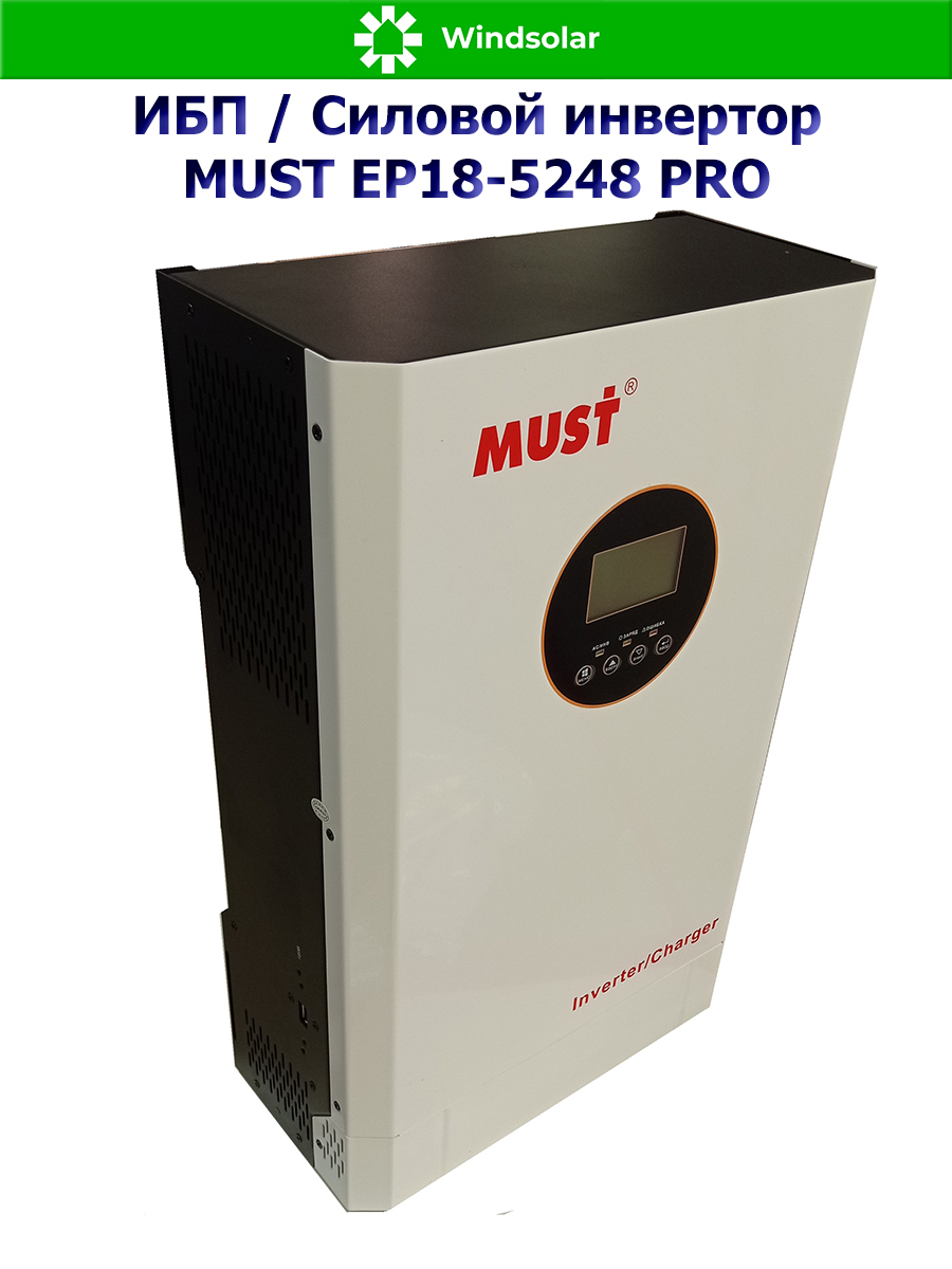 MUST EP18-5248 PRO (5,2 кВт, 48 В) – это высокочастотный инвертор/ИБП, обеспечивающий чистую синусоиду и мгновенное переключение между сетью 230 В, генератором и аккумулятором. Идеальное решение для резервного питания в случае отключения электроэнергии, защищая вашу технику и обеспечивая непрерывную работу критически важного оборудования.
