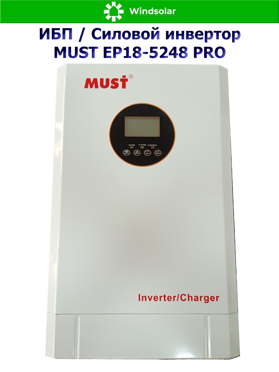 Инвертор ИБП MUST EP18-5248 — высокочастотный инвертор+ зарядное устройство 5,2 кВт на 48 В с чистой синусоидой и быстрым автоматическим переключением между сетью 230 В, генератором и аккумулятором. Удобный LCD-дисплей позволяет задать приоритет работы (сеть/АКБ), диапазон входного напряжения (домашняя сеть или «расширенный» для генератора), а также зарядный ток под тип батарей.