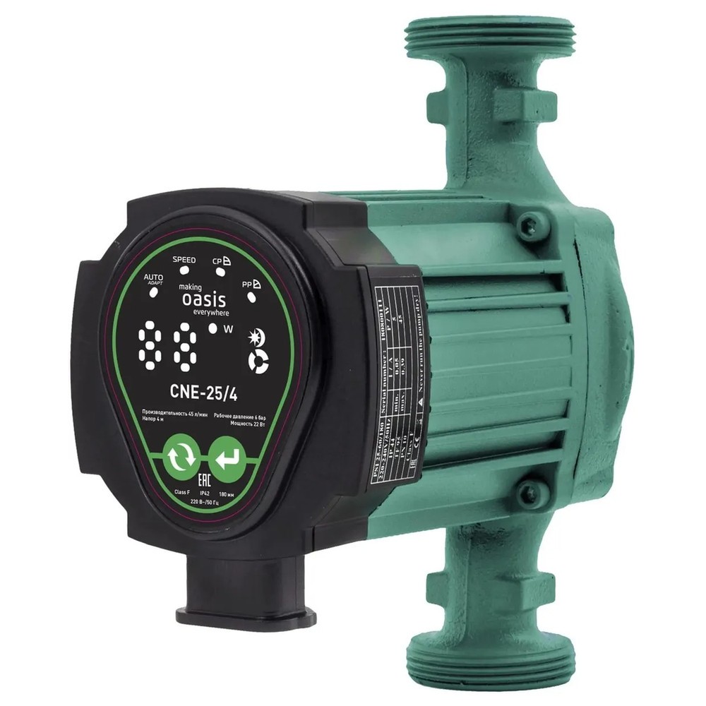 Oasis CNE 25/4 — циркуляционный насос с «мокрым» ротором для систем отопления, предназначен для перекачивания теплоносителя с температурой до 100 °C. Обеспечивает напор до 4 м и производительность до 2,7 м³/ч. Подходит для горизонтальной или вертикальной установки. Корпус выполнен из чугуна, управление электронное.