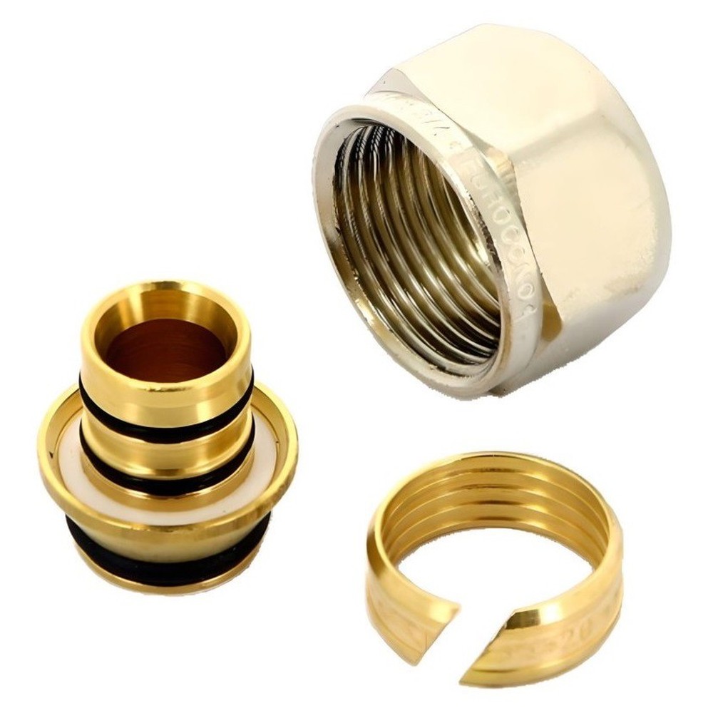 Латунный фитинг с накидной гайкой и обжимным кольцом для подключения металлополимерной трубы к коллектору vieir с выходами диаметром 3/4", стандарт соединения – «евроконус».