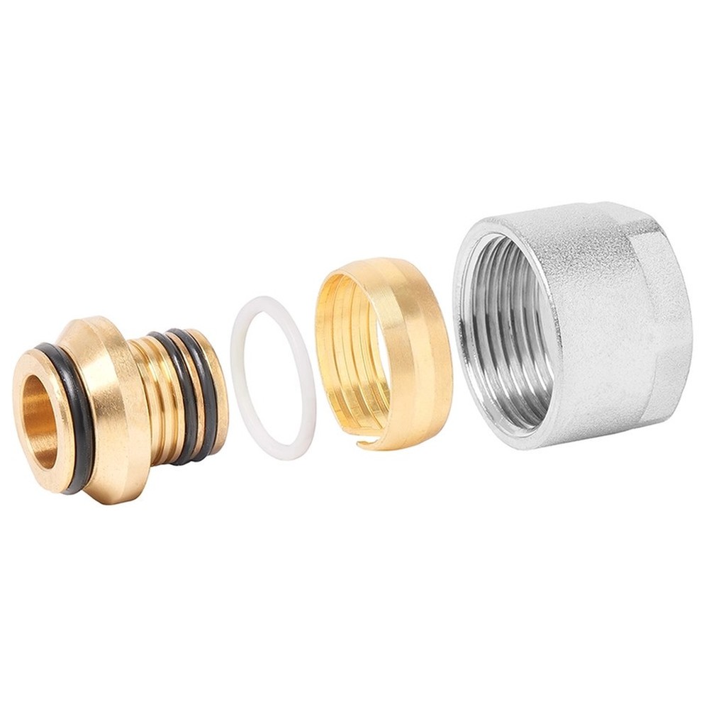 радиатора. Состоит из евроконусного штуцера с уплотнениями (антигальваническая изоляция), накидной гайки 3/4″ и разрезного кольца.