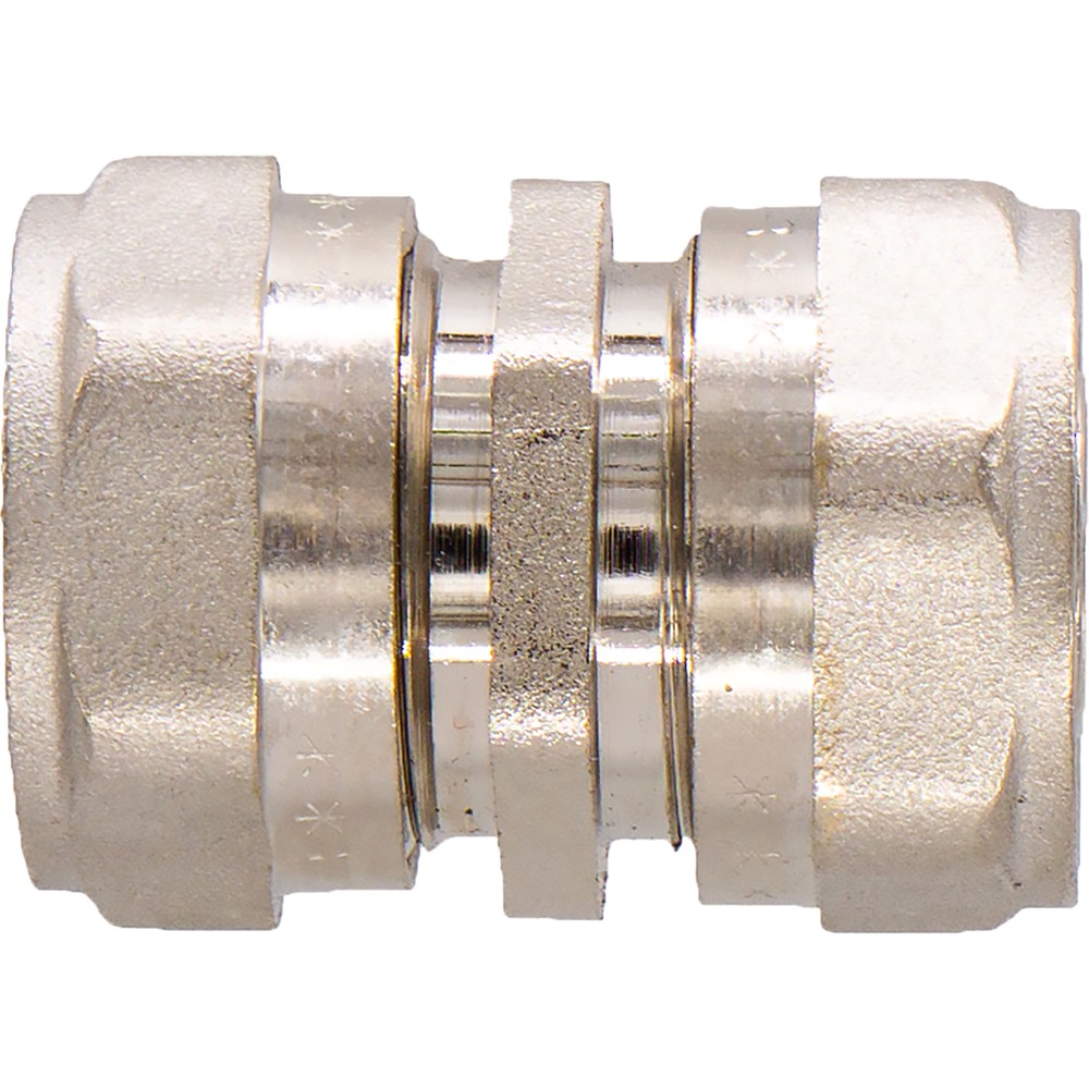 Муфта промежуточная 16х16 CTM - обжимной фитинг для соединения металлопластиковой (металлополимерной) трубы. Изготовлена методом горячей штамповки из латуни с последующей термической обработкой и никелированием для предотвращения появления коррозии, механического износа и вредного воздействия агрессивных жидкостей и воздушно-газовых сред. Корпус, накидные гайки и обжимные кольца промежуточной муфты изготовлены из латуни, уплотнительное кольцо из нетоксичной резины (EPDM), и диэлектрическая прокладка из фторопласта Ф4. Накидные гайки – усиленные.