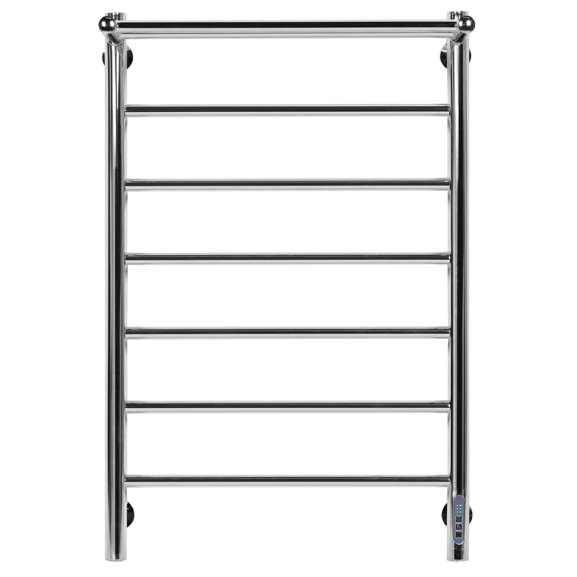 Классическая модель электрического полотенцесушителя тип "лесенка с полкой" с симметрично расположенными прямыми перекладинами. Особенностью полотенцесушителя является полка, через которую проходит нагревательный контур, поэтому нагрев происходит равномерно, а температура поверхности одинакова по всему периметру прибора.