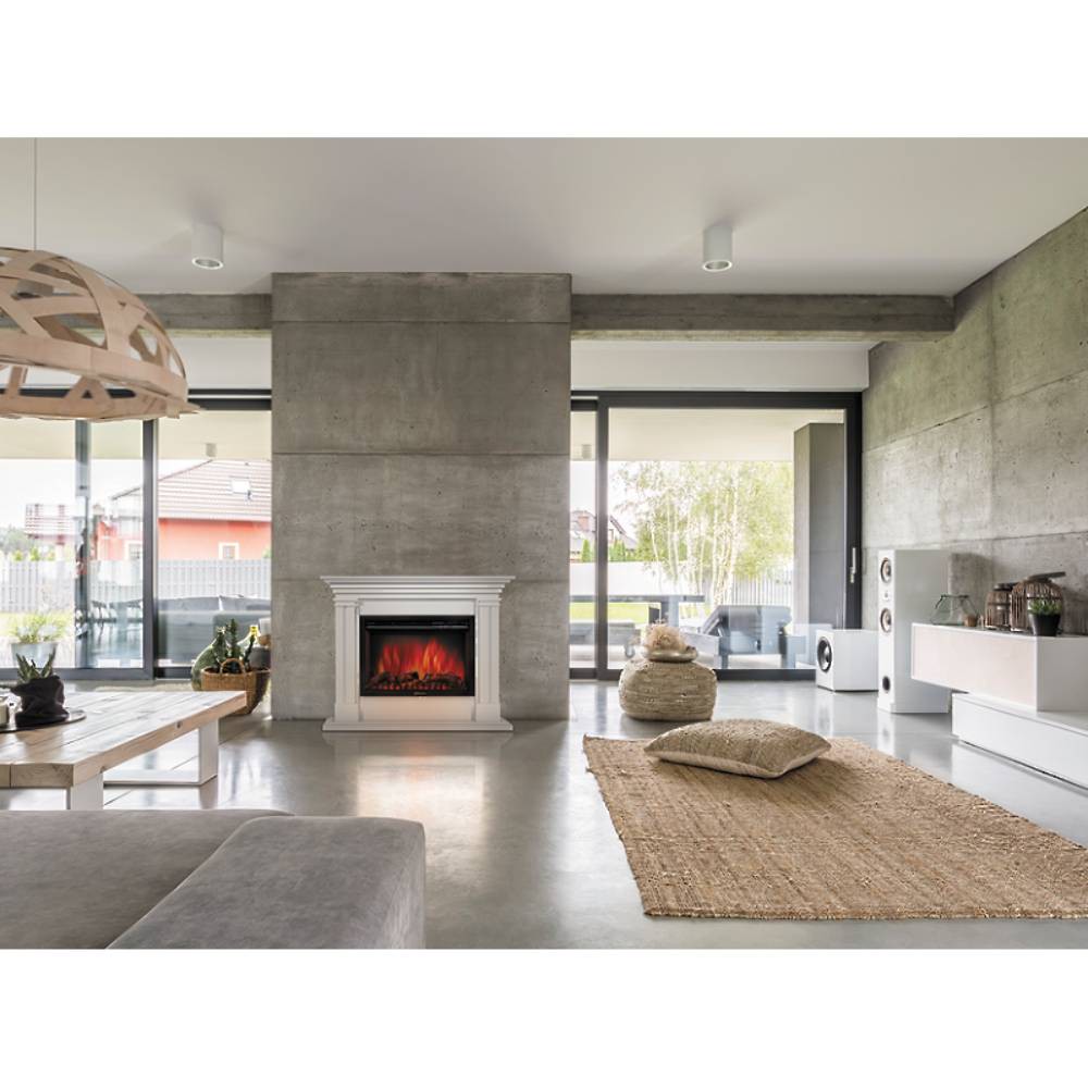 Многоуровневый верх портала визуально ведет взгляд зрителя к яркому реалистичному пламени очага. Лаконичные стилизованные колонны завершают классический облик портала и придают ему особую легкость.