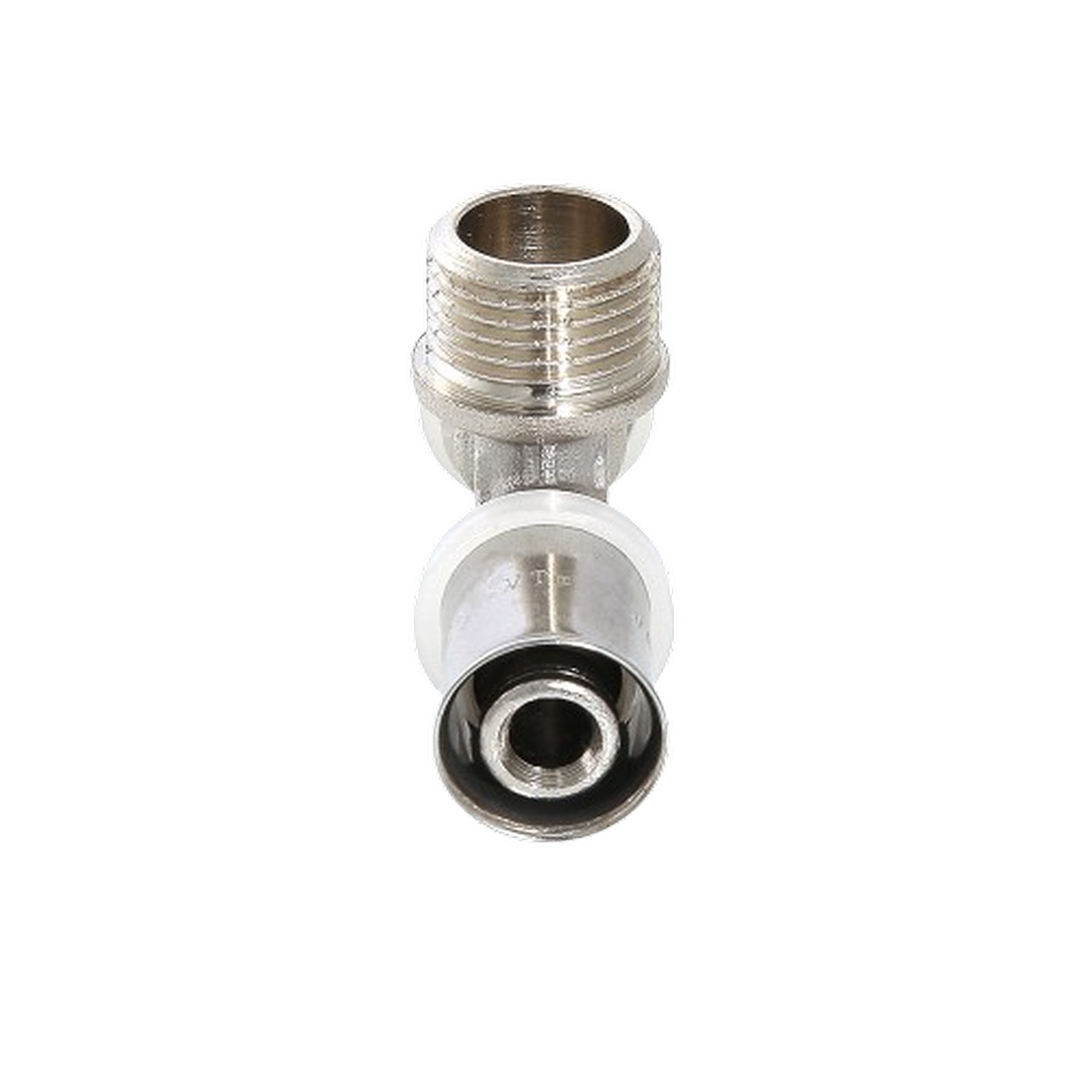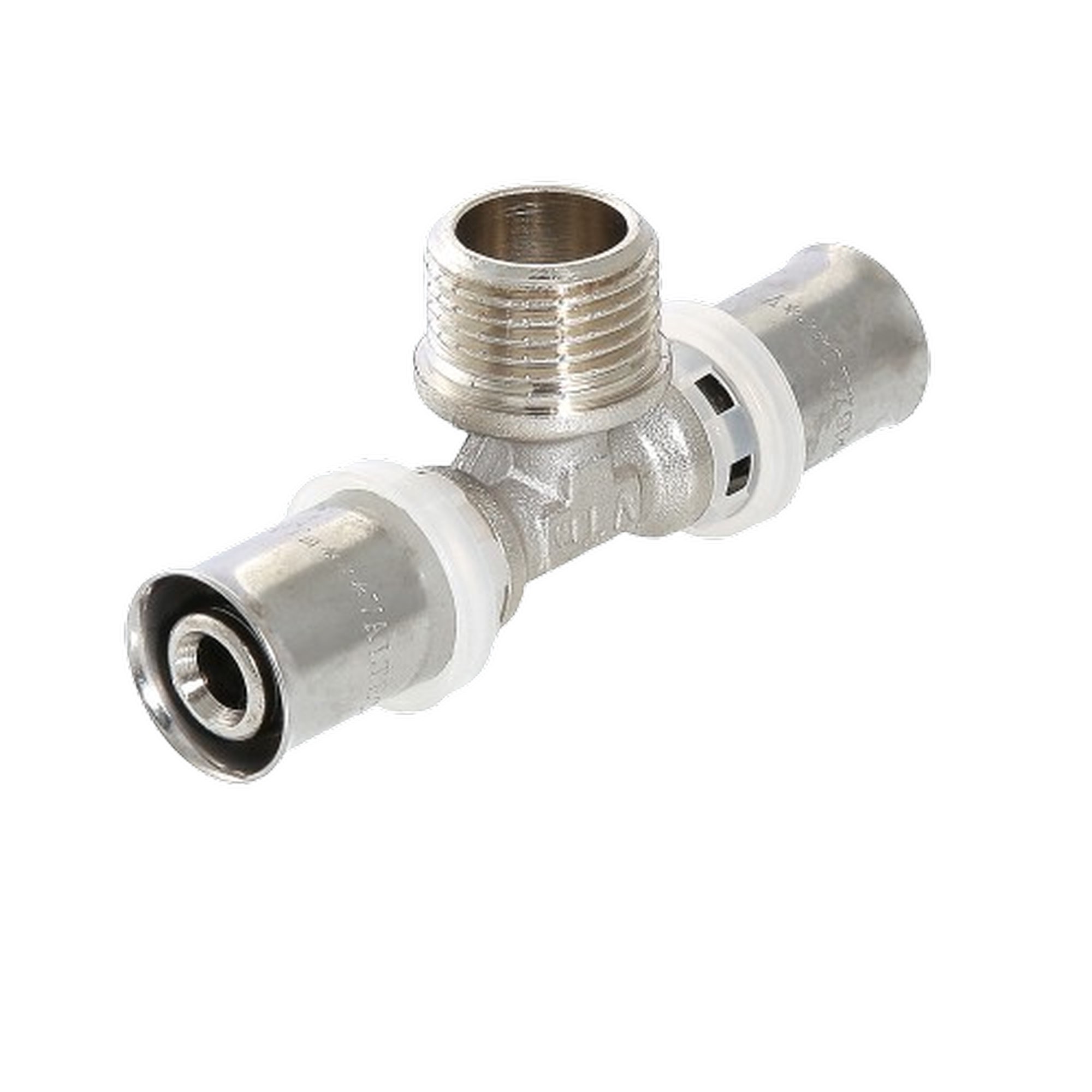 Пресс-фитинг – тройник с переходом на наружную резьбу предназначен для подсоединения к металлопластиковым (металлополимерным) трубам или трубам из сшитого полиэтилена элемента системы с внутренней резьбой. Резьба фитинга – трубная по ГОСТу 6357.