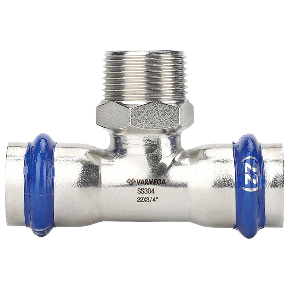 Тройник с наружной резьбой Varmega Inox Press с двух сторон имеет раструбное соединение для труб, а с другой стороны фитинга находится наружное резьбовое соединение. Данный фитинг позволяет присоединить к трубопроводу различные резьбовые элементы (краны, фильтры и т. п.), также дает возможность подключиться к другому типу трубопровода. Для получения надежного неразъемного соединения трубы и фитинга потребуется специальный пресс-инструмент с насадками типа профиль «V».