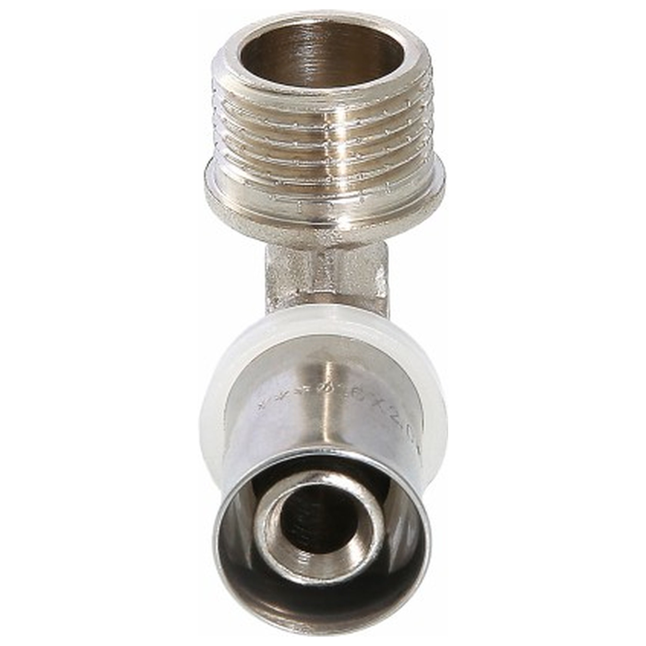 Угловой пресс-фитинг для подсоединения к металлопластиковой трубе (металлополимерная труба) или трубе из сшитого полиэтилена элемента системы с резьбовым подключением. Резьба фитинга – наружная трубная по ГОСТу 6357.