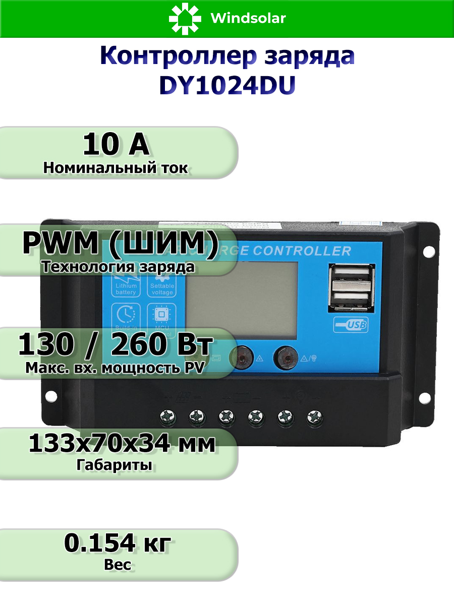 Контроллер заряда DY1024DU (10A, 12/24В) используется только для солнечных электростанций (солнечные батареи, аккумуляторы, инверторы). Аккумуляторные батареи заряжаются при помощи солнечных батарей.