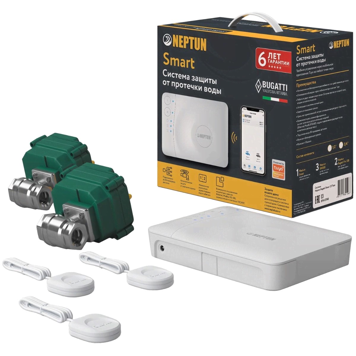 Модуль управления Neptun Smart Tuya - 1 шт; Кран шаровый с электроприводом Neptun Bugatti 12В - 2 шт; Датчик проводной SW005 (длина 2 м.) - 3 шт.