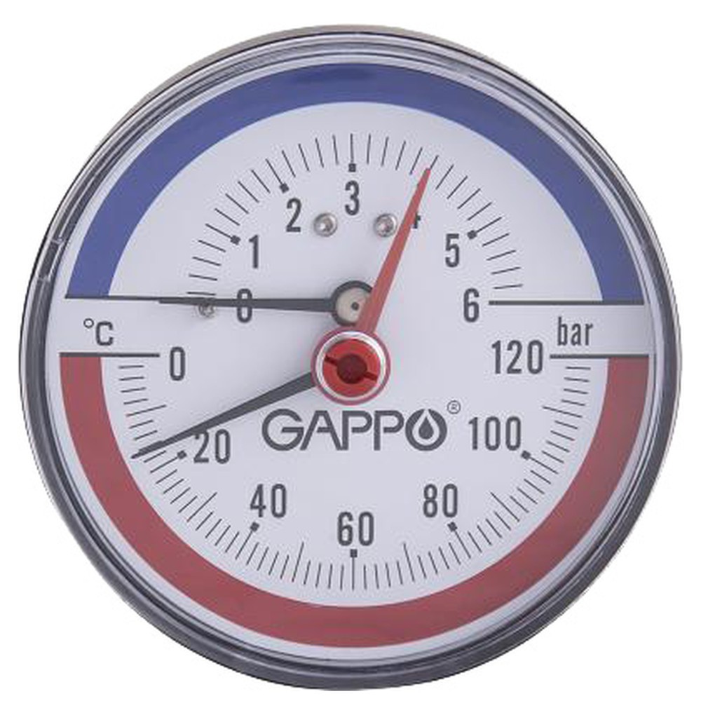 Термоманометр Gappo — комбинированное устройство для измерения температуры и давления. Аксиальный тип — штуцер подключения расположен сбоку корпуса, что удобно для монтажа в шкафах или стенах.
