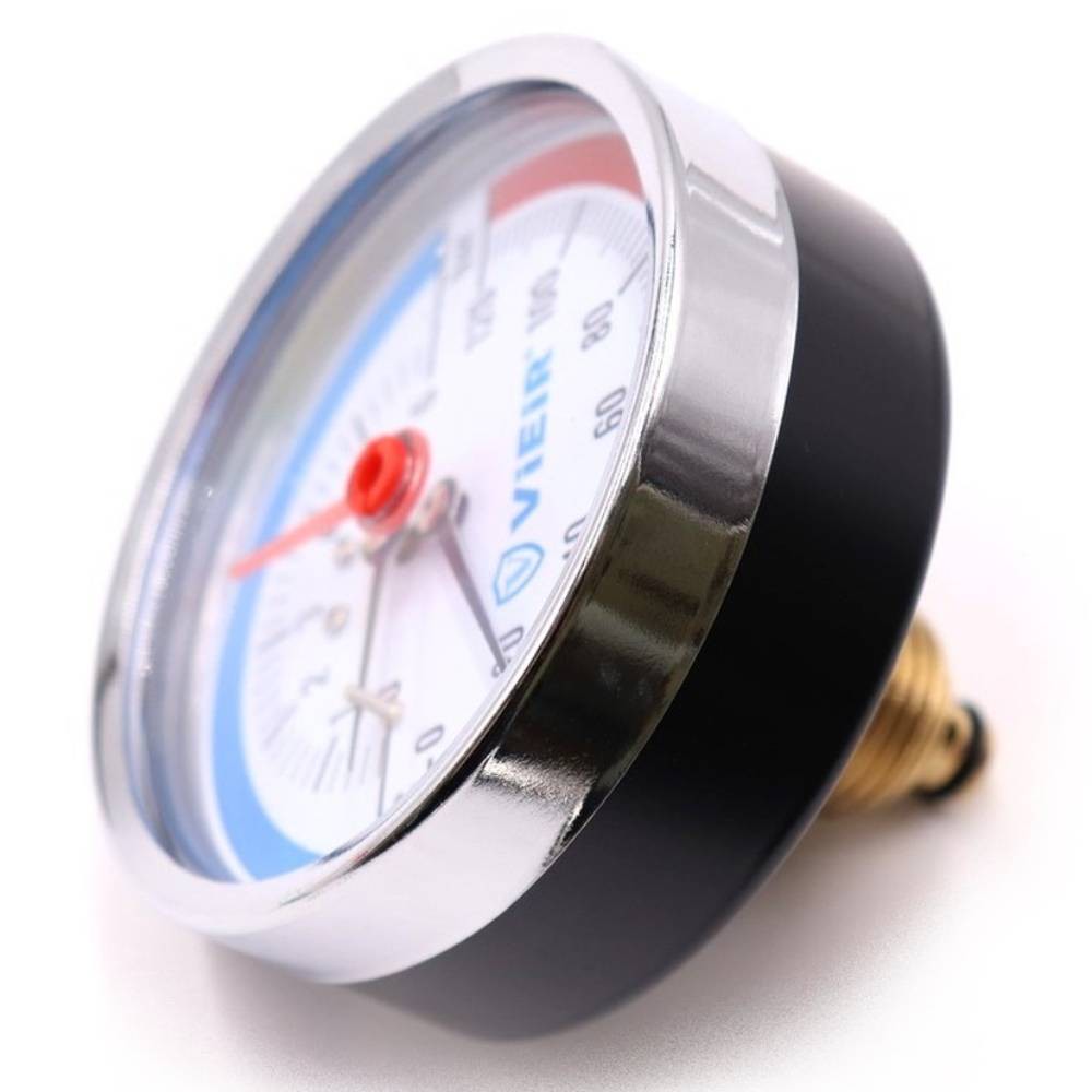 ViEiR Термоманометр 1/2", горизонтальный (80 мм/6 бар) (YF6). ViEiR Термоманометр с горизонтальный подключением применяют для контроля избыточного давления жидкостей или газов, контролируемая среда не должна бытьне вязкой, кристаллизующейся, а также их температуры до + 120 °C.