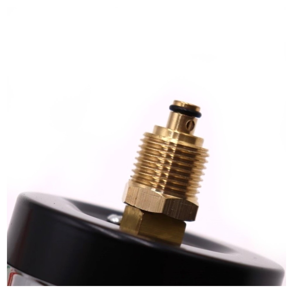 Термоманометр имеет верхнее соединение из латуни с резьбой 1/2″. Корпус изготовлен из металла устойчивого к коррозии и окрашен высококачественной эмалью черного цвета для дополнительной защиты от коррозии.