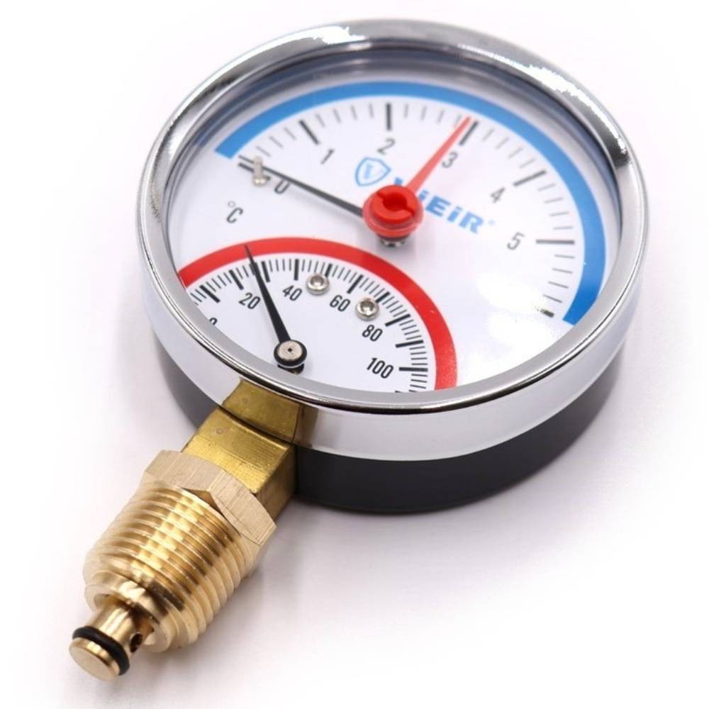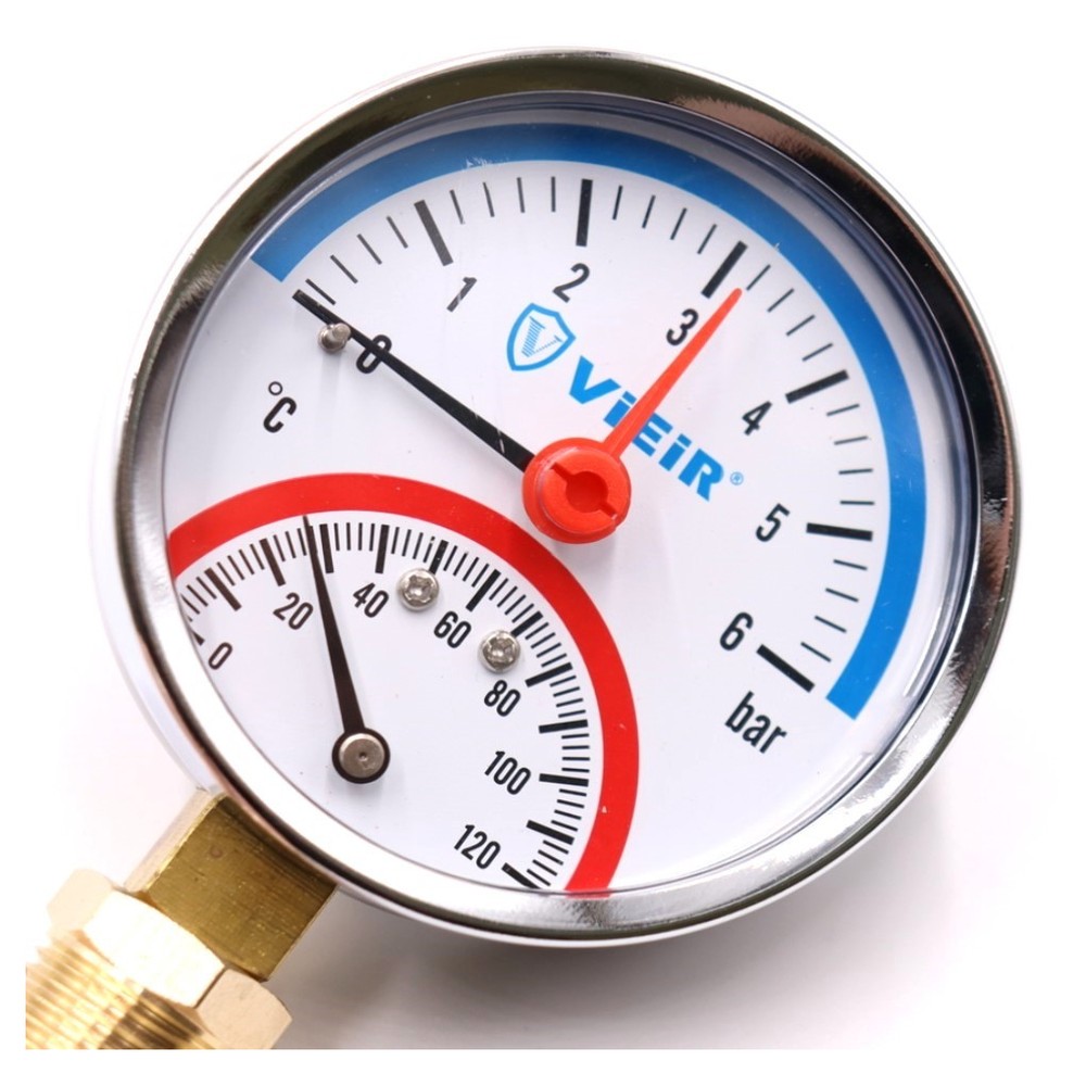 ViEiR Термоманометр 1/2", вертикальный (80 мм/6 бар) (YE6). ViEiR Термоманометр с вертикальным подключением применяют для контроля избыточного давления жидкостей или газов, контролируемая среда не должна быть вязкой, кристаллизующейся, а также их температуры до + 120 °C.