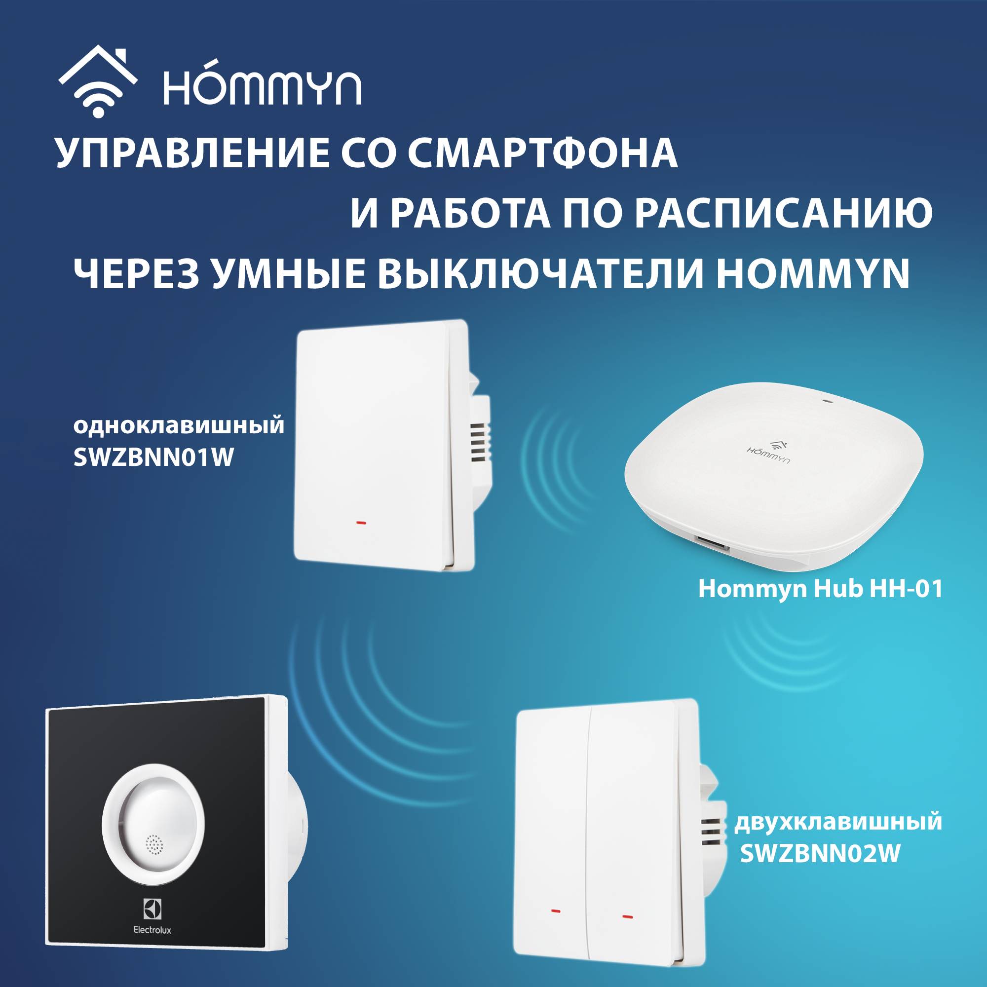 Для управления вытяжным вентилятором со смартфона и настройки работы по расписанию необходимо подключить его через умный выключатель или реле Hommyn! при необходимости установить Блок управления (шлюз) HOMMYN