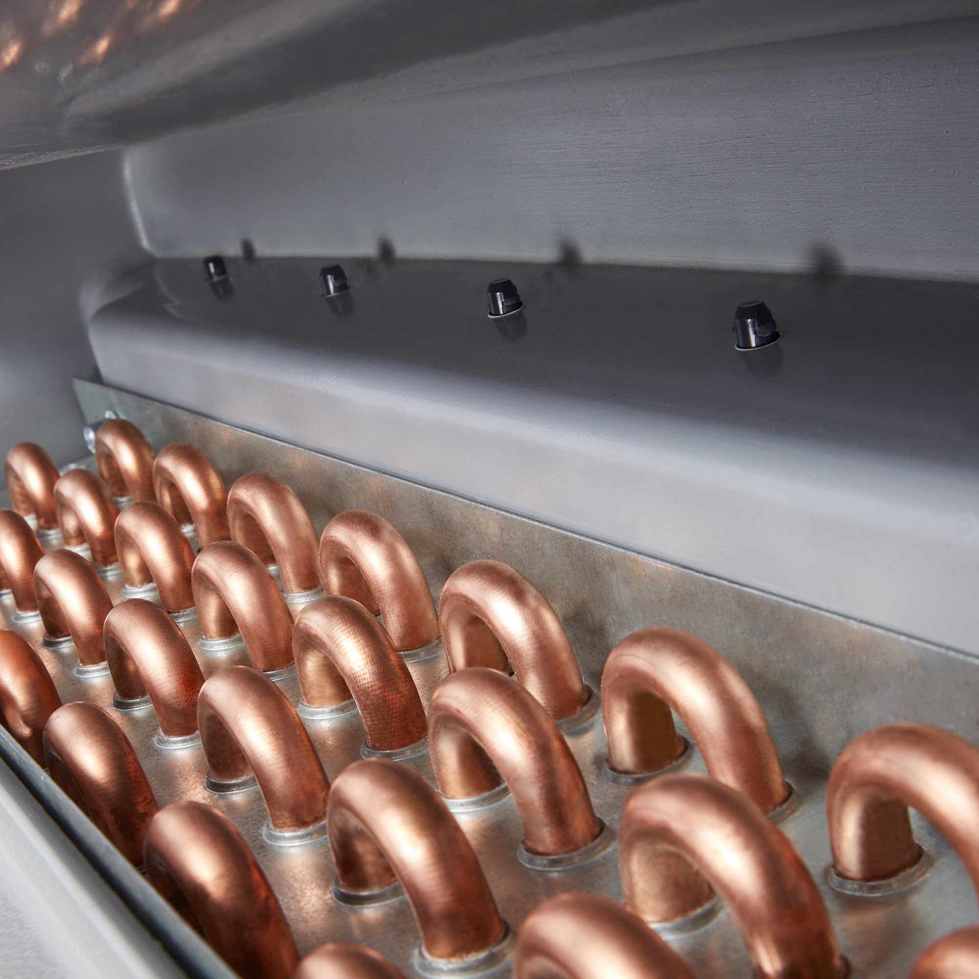 Теплообменники с увеличенным фронтом и рядностью обеспечивают высокую тепловую мощность даже при низкотемпературном теплоносителе.